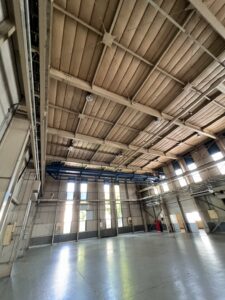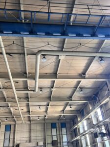 高天井空間での作業となるため、高所作業車や足場の設置が必須となりますが、